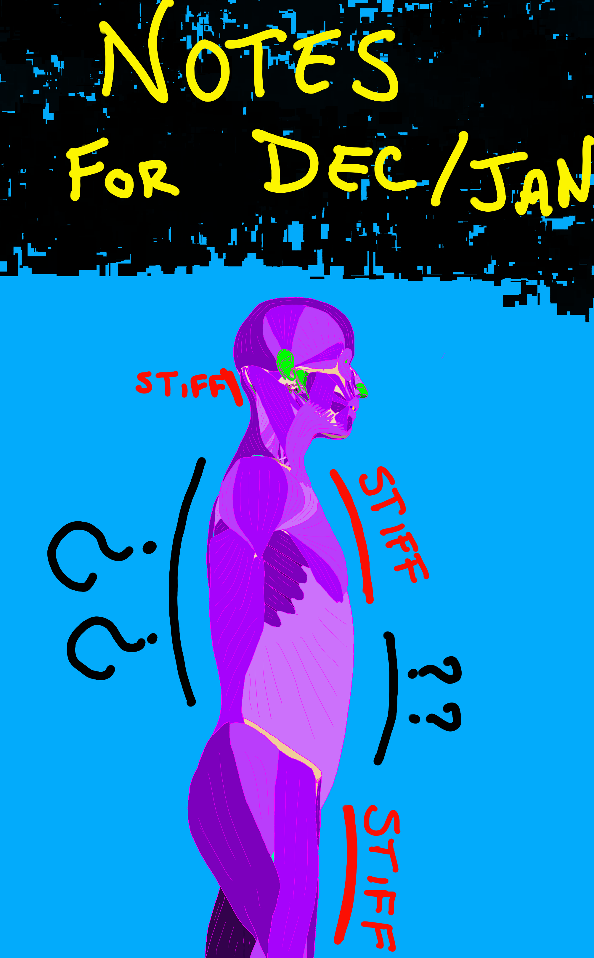 In the image above, I’ve highlighted things in red and black. The red areas are ones that are absolutely positively stiff zones for you (and many many many people). I’ve highlighted the other bits of the torso with black because I suspect these areas feel lethargic or dead. As you lie down or sit quietly in a comfortable chair1, you can ask yourself the very simple meditative question,