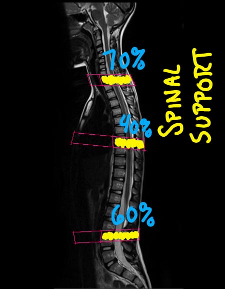In the image above, I have drawn some red cross sections from front to back. Notice at the neck how HUGE the spine is. I’ve labeled it as 70% of the depth of the neck, 40% of the depth of the ribcage, and 60% of the lower back4. That’s a pretty fast and lose eyeball estimate. I do not want you walking around calculating percentages in your head.