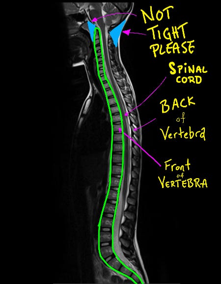 At the back of the person, you will see a tiny pink arrow pointing to the back of a vertebra. In front of that, you will see the spinal cord (you can trace that grey channel down from the brain. And in front of that, you will see the front portion of the same vertebra.