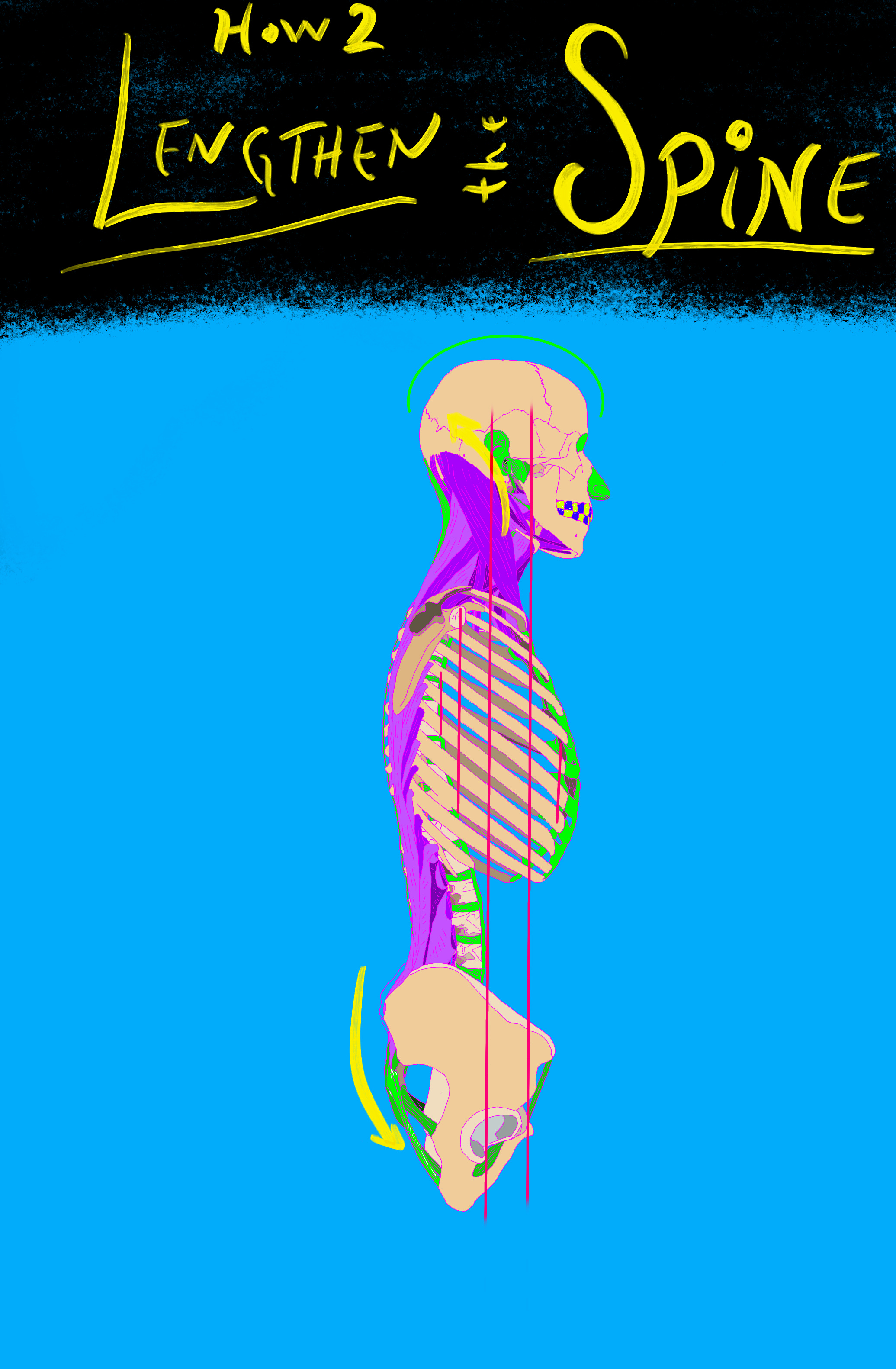 The yellow arrows mark the release of the top and bottom of the spine. I don’t want you to actively try and pull your spine in these directions, but you may be able to sense the top and bottom releasing tension if you quietly think about these areas. I’ve written pieces on the release of the top of the spine in the past. For the base of the spine, this post has a good reference image. Try them one at a time.