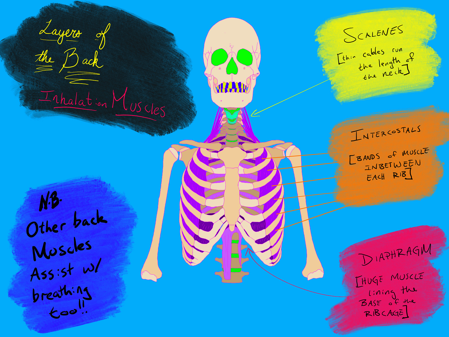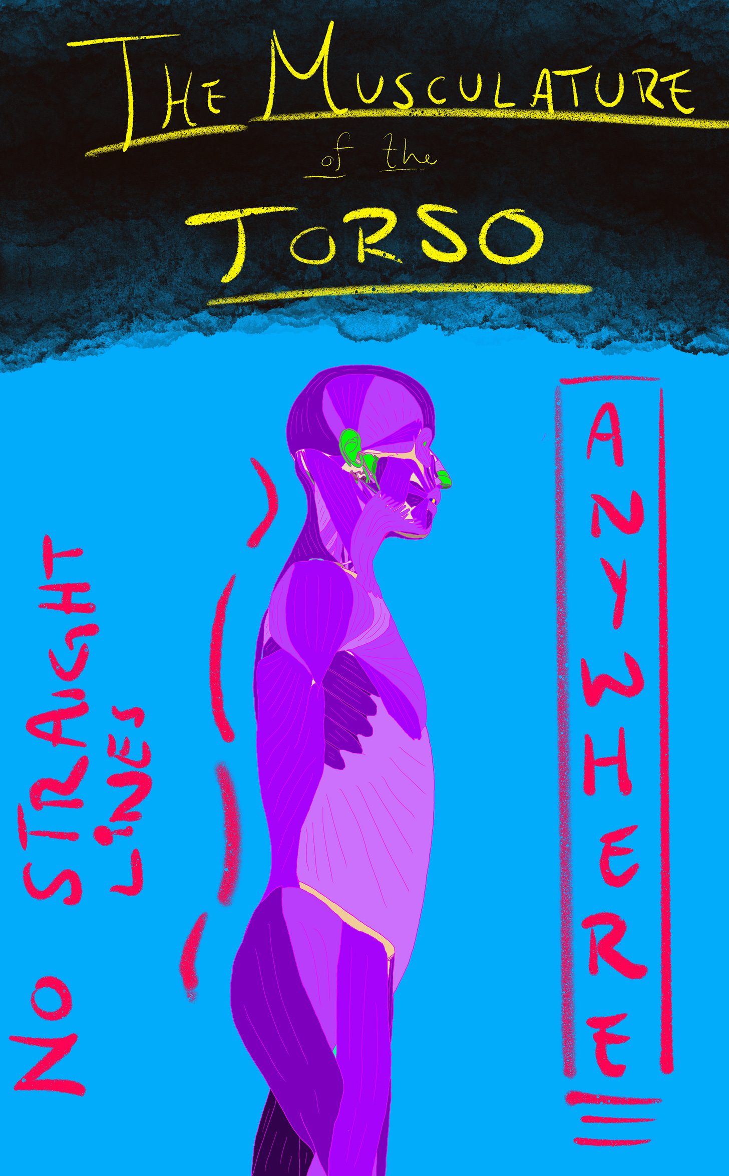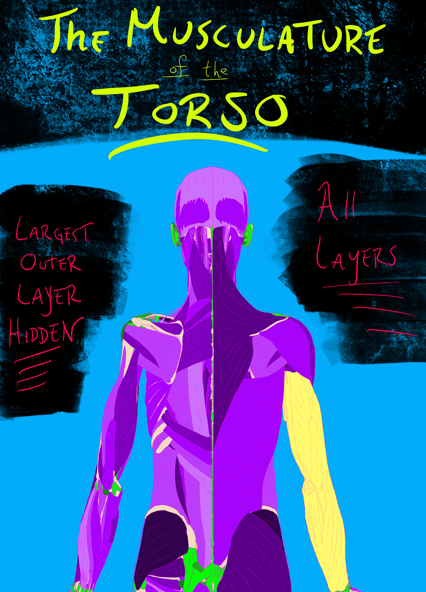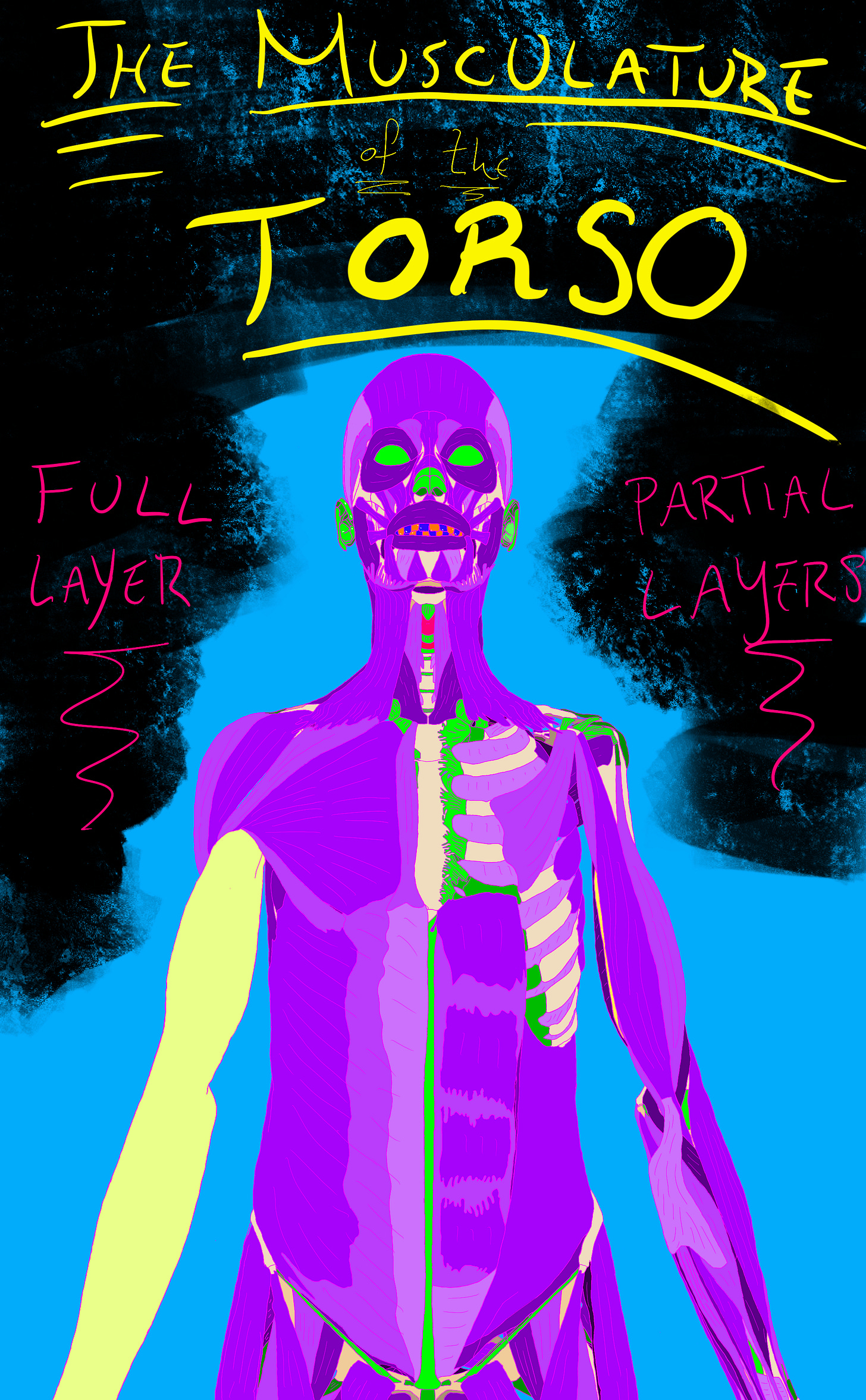 This week, I completed most of the drawings I want to do to give you a sense of what the torso is. These views leave out a lot; particularly when it comes to giving you a sense of the inner space of the back. But what they can give you is a sense of the 3 main functions of the torso: breathing, spinal support, and all the other stuff.